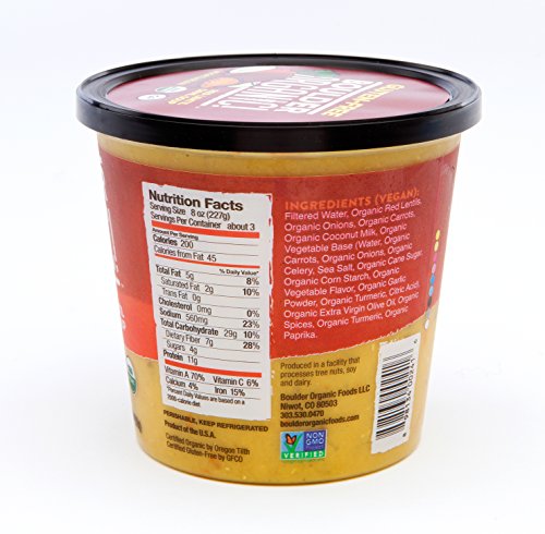 vegetable broth (filtered water, vegetable base (vegetable stock and vegetable concentrates (carrot, celery, onion, tomato), sea salt, blue agave syrup, nutritional yeast, potato starch, tamarind puree, champignon mushroom powder, garlic powder, guar gum, spice)), red lentils, onions, carrots, coconut milk, extra virgin olive oil, spices, turmeric, paprika, organic
