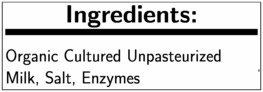 Mild Cheddar, Unpasteurized Ingredients: Organic Cultured Unpasteurized Milk, Salt, Vegetarian Enzymes.
