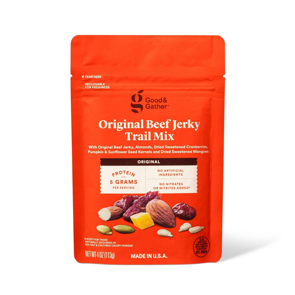 ORIGINAL BEEF JERKY TRAIL MIX WITH ORIGINAL BEEF JERKY, ALMONDS, DRIED SWEETENED CRANBERRIES, PUMPKIN & SUNFLOWER SEED KERNELS AND DRIED SWEETENED MANGOES, ORIGINAL BEEF JERKY