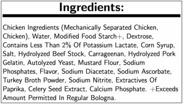 MECHANICALLY SEPARATED TURKEY, WATER, TURKEY BROTH, MODIFIED FOOD STARCH+, DEXTROSE, CONTAINS LESS THAN 2% OF POTASSIUM LACTATE, CORN SYRUP, SALT, HYDROLYZED BEEF STOCK, CARRAGEENAN, HYDROLYZED GELATIN (FOR FLAVOR), AUTOLYZED YEAST, FLAVOR, SODIUM PHOSPHATES, SODIUM DIACETATE, SODIUM ASCORBATE, SODIUM NITRITE, EXTRACTIVE OF PAPRIKA.