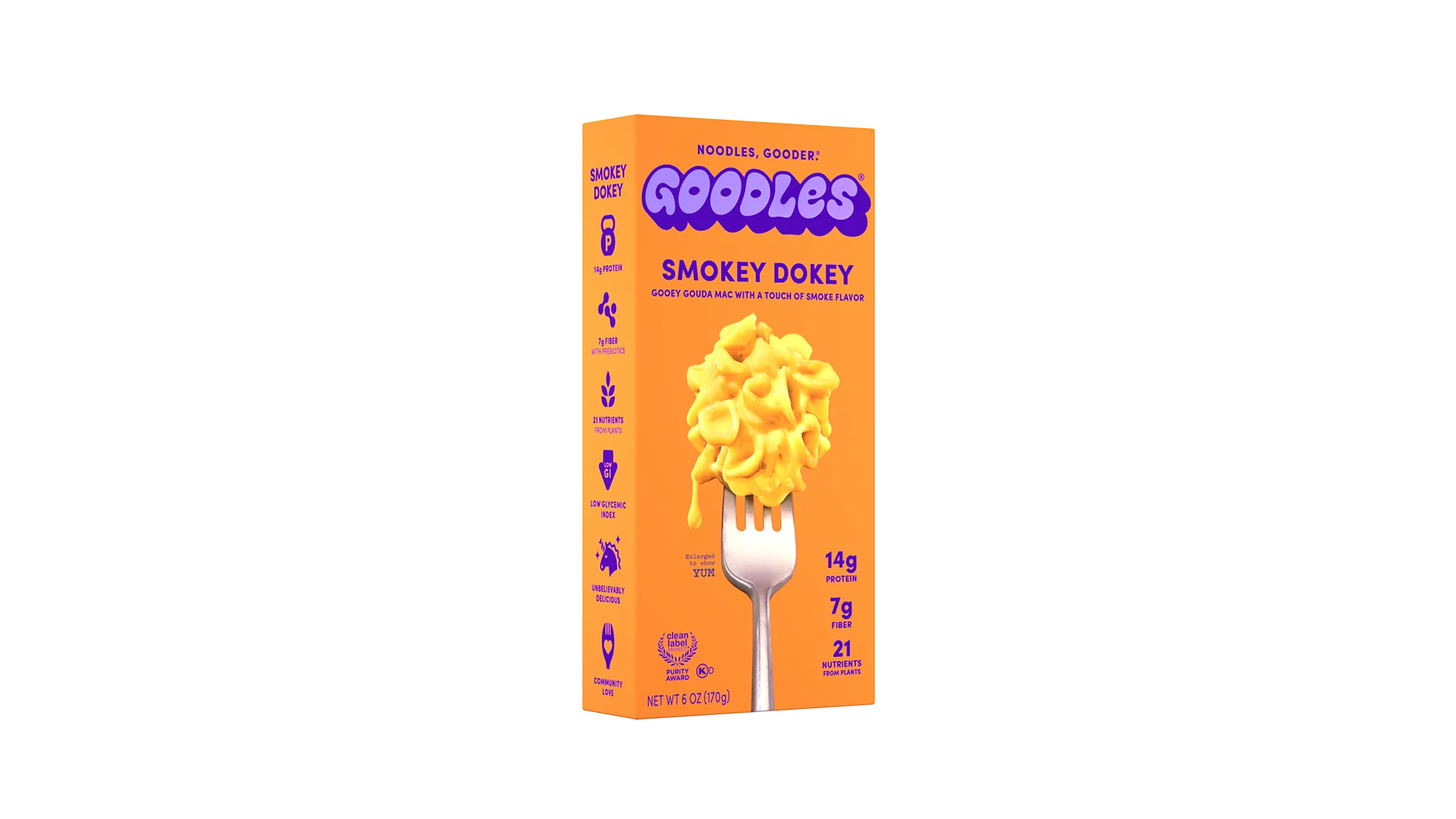 GOODLES NOODLES (WHEAT FLOUR, CHICKPEA PROTEIN, WHEAT PROTEIN, NUTRIENTS EXTRACTED FROM [BROCCOLI, SPINACH, KALE, PUMPKIN, SWEET POTATO, SUNFLOWER SEED, CRANBERRY, CHLORELLA, MAITAKE MUSHROOM, SHIITAKE MUSHROOM]), GOUDA CHEESE BLEND (CULTURED MILK, WHEY, BUTTERMILK, SALT, DISODIUM PHOSPHATE, LACTIC ACID, ENZYMES), BUTTER (CREAM, SALT, ENZYMES), SALT, TAPIOCA FLOUR, NUTRITIONAL YEAST, NATURAL HICKORY SMOKE FLAVORING, ANNATTO (FOR COLOR).