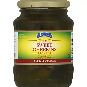 Cucumbers, Sugar, Vinegar, Water, Salt, Calcium Chloride, Alum, Natural Flavour, Polysorbate 80, Yellow 5.