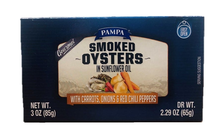 Smoked Oysters, Sunflower Oil, Carrots, Onions, Red Chili Peppers, Salt.