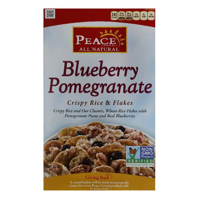 PEACE CEREAL, CRISPY RICE & FLAKES, CRISPY RICE AND OAT CLUSTERS, WHEAT-RICE FLAKES WITH POMEGRANATE AND REAL BLUEBERRIES, BLUEBERRY POMEGRANATE, BLUEBERRY POMEGRANATE