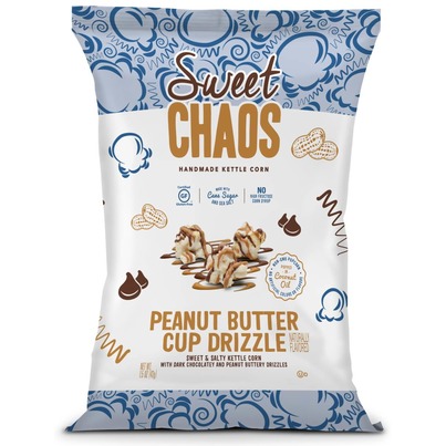 PEANUT BUTTER CUP DRIZZLE FLAVORED SWEET & SALTY KETTLE CORN WITH DARK CHOCOLATEY AND PEANUT BUTTERY DRIZZLES HANDMADE KETTLE CORN, PEANUT BUTTER CUP DRIZZLE