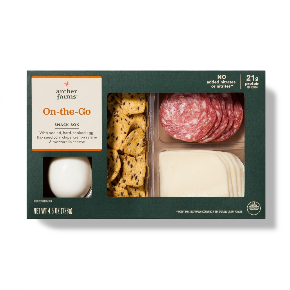 GENOA SALAME (PORK, SEA SALT, LESS THAN 2% OF: TURBINADO SUGAR, SPICES, NATURAL FLAVORING, ORGANIC WINE, LACTIC ACID STARTER CULTURE); HARD BOILED EGG (HARD BOILED EGG, CITRIC ACID, SODIUM BENZOATE); MOZZARELLA CHEESE (PASTEURIZED MILK, CHEESE CULTURES, VINEGAR, ENZYMES, SALT); FLAX SEED CORN CHIPS (YELLOW CORN MASA, FLAX SEED, SOYBEAN OIL, SALT).