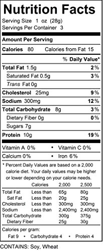 Beef, Seasoning (Sugar, Garlic, Onion, Salt, Spices), Soy Sauce (Water, Wheat, Soybeans, Salt), Water, Liquid Smoke, Sodium Nitrite, Contains: Soy, Wheat