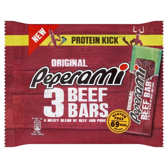 Beef, Pork, Sugar, Iodised Salt (Salt, Potassium Iodate), Spices, Flavour Enhancers (Monosodium Glutamate, Disodium Inosinate, Disodium Guanylate), Sodium Nitrite), Beechwood Smoke, G Peperami Flavour Meat Bar Is 67 G Beef And 65 G Pork