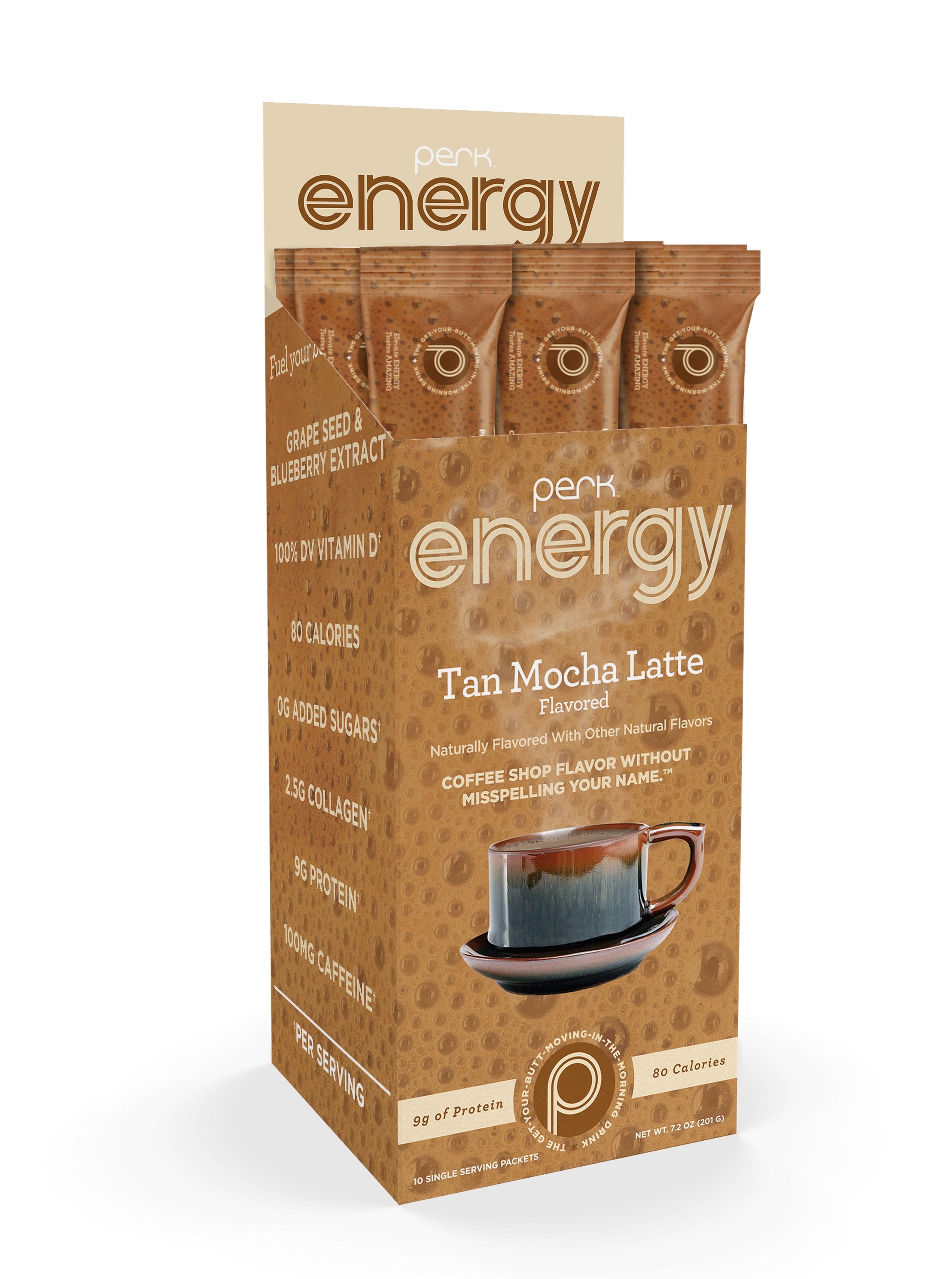 Perk Energy Original Tan Mocha Latte Flavored Drink Powder (10 Servings Stickpack) - Gluten-Free, Peanut-Free, Soy-Free