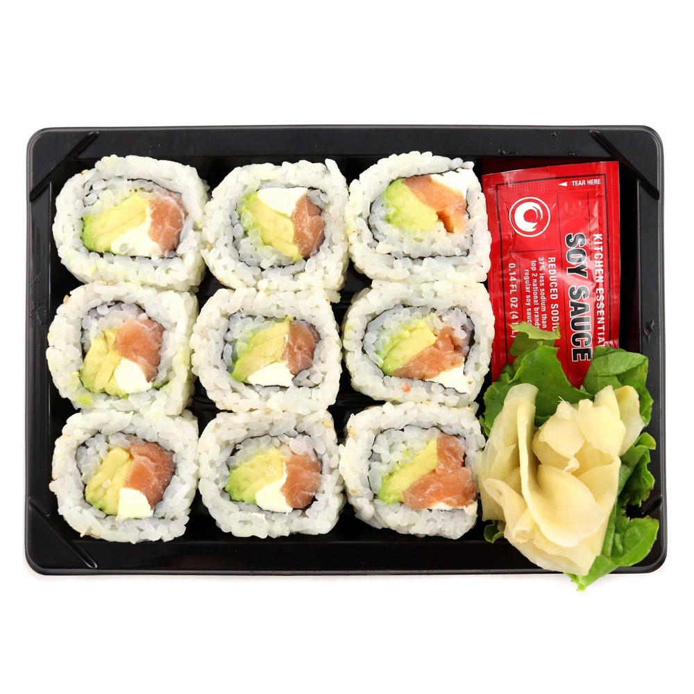 SUSHI RICE (WATER, WHITE RICE, SUSHI VINEGAR (SUGAR, RICE VINEGAR, WATER, SALT, CITRIC ACID, KELP EXTRACT (KELP EXTRACT, SORBITOL, MALTITOL, HYDROGENATED STARCH HYDROLYSATES, ALCOHOL, SALT, XANTHAN GUM))), RAW SALMON, AVOCADO, CREAM CHEESE (PASTEURIZED MILK AND CREAM, CHEESE CULTURE, SALT, ORGANIC LOCUST BEAN GUM), PICKLED GINGER (GINGER, WATER, SALT, SUGAR, VINEGAR), SESAME SEEDS, SEAWEED, LETTUCE.