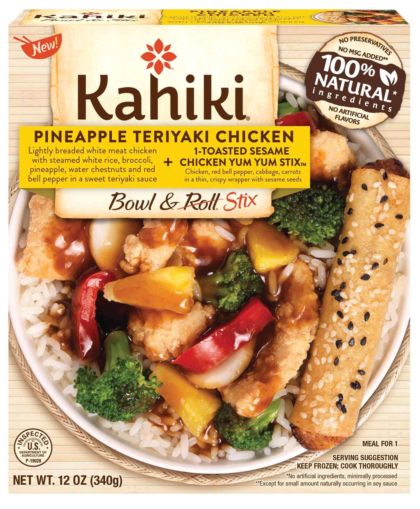 Bowl (Cooked Rice, Sauce (Water, Sugar, Soy Sauce (Water, Wheat, Soybeans, Salt), Raisin Juice Concentrate, Ginger, Salted Sake (Water, Rice, Koji (Aspergillus Oryzae), Salt), Corn Starch, Garlic, Pineapple Juice Concentrate, Contains 2% Or Less Of: Distilled White Vinegar, Molasses, Salt, Xanthan Gum,), Lightly Breaded Chicken (Chicken White Meat, Wheat Flour, Water, Contains 2% Or Less Of: Potato Starch, Soy Sauce (Water, Wheat, Soybeans, Salt), Salt, Soy Protein Concentrate, Yeast Extract, Spices, Eggs, Fried In Vegetable Oil), Broccoli, Pineapple, Water Chestnuts, Red Bell Pepper,), Stix (Filling: (Chicken, Cabbage, Yellow Carrots, Cornstarch, Red Cabbage, Green Onion, Red Bell Pepper, Sugar, Contains 2% Or Less Of: Functional Soy Protein Concentrate, Naturally Brewed Soy Sauce (Water, Wheat, Soybeans, Salt, Maltodextrin), Vegetable Oil, Ginger, Distilled White Vinegar, Salt, Yeast Extract, Chicken Soup Base (Roasted Chicken, Salt, Sugar, Onion Powder, Natural Flavorings), Garlic Powder, Onion Powder, Spices), Wrapper: (Water, Sesame Seeds (White And Black), Tapioca Dextrin, Wheat Flour, Contains 2% Or Less Of: Vegetable Oil, Salt), Fried In Vegetable Oil,)
