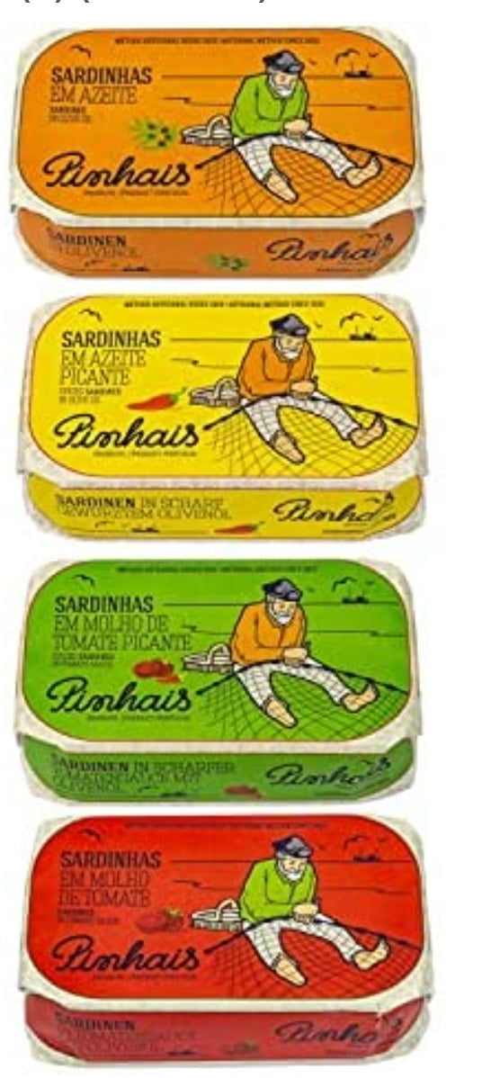 Pinhais Canned Sardines Variety Pack 4.4 oz- Virgin Olive Oil Regular (1), Virgin Olive Oil Spicy (1), Tomato Sauce Regular (1) and Tomato Sauce Spicy (1) (Pack of 4) Bonus mints included!