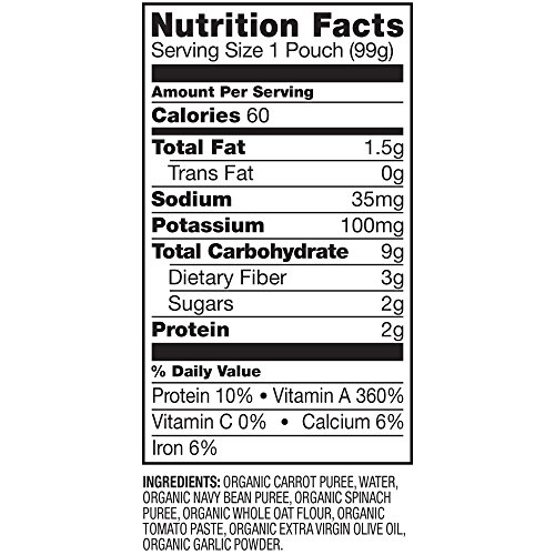 INGREDIENTS: ORGANIC CARROTS, WATER, ORGANIC WHITE BEAN PUREE, ORGANIC SPINACH PUREE, ORGANIC WHOLE OAT FLOUR, ORGANIC TOMATO PASTE, ORGANIC EXTRA VIRGIN OLIVE OIL, ORGANIC GARLIC POWDER.