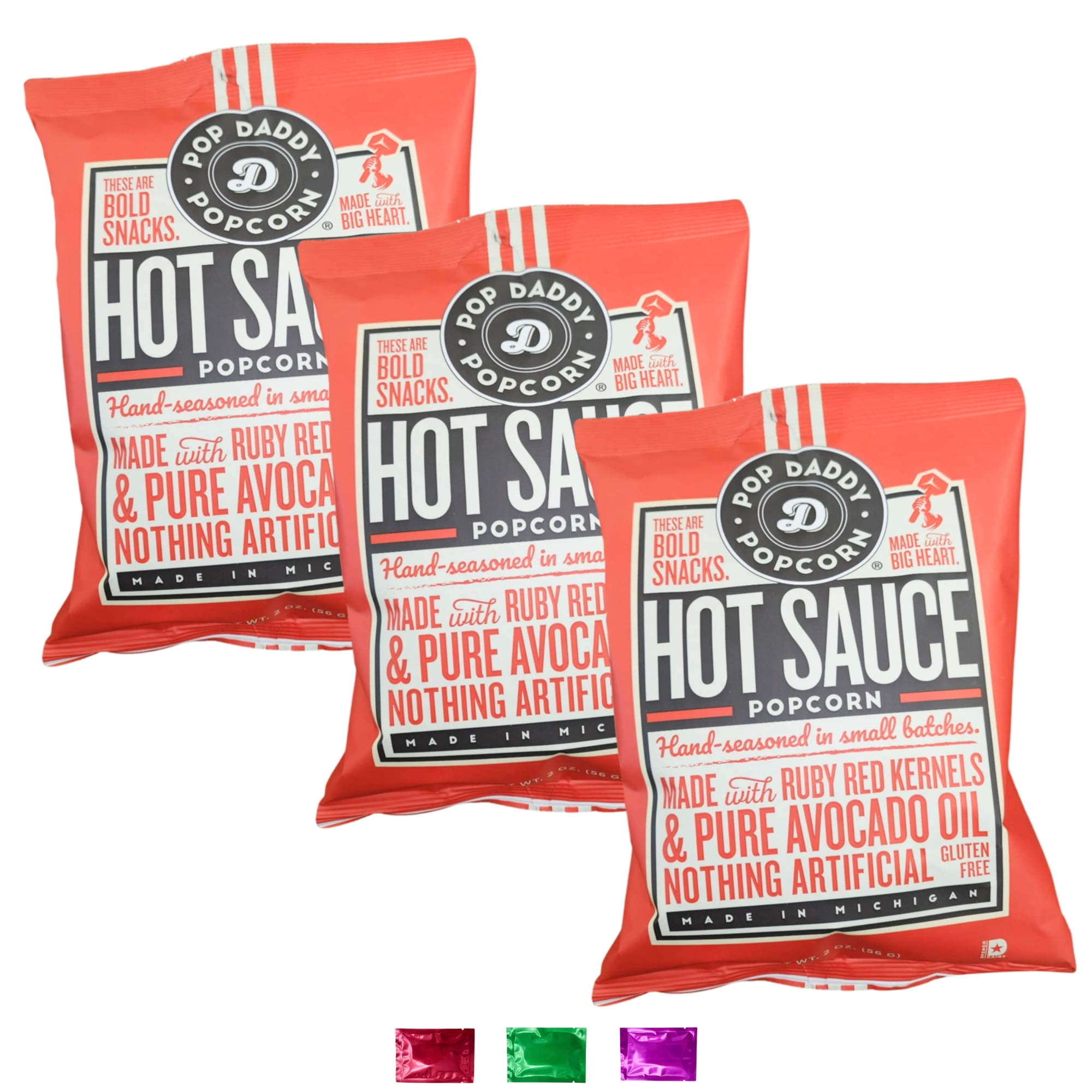 Pop Daddy Hot Sauce Popcorn Snack 2 Oz Pack of 3, Gourmet Hand‑Seasoned Ruby Red Kernels, Gluten Free Bold Spicy Flavor for Movie Night Tailgating On the Go w/ Snoep in Beperkte Oplage