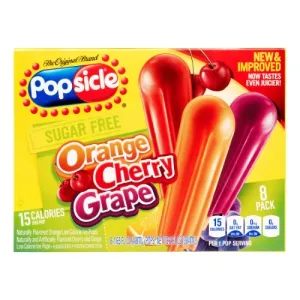 POPSICLE, ICE POPS, SUGAR FREE, NATURALLY FLAVORED ORANGE, NATURALLY AND ARTIFICIALLY FLAVORED CHERRY AND GRAPE, LOW CALORIE, ORANGE, CHERRY, GRAPE