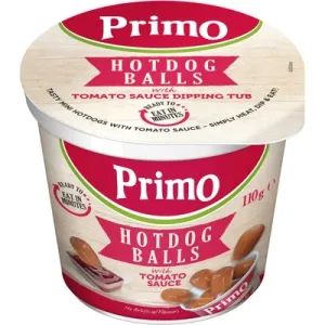 Hotdog Balls [Meat Including Pork, Water, Seasoning [Potato Starch, Spices, Salt, Dextrose (Maize or Tapioca), Mineral Salts (450, 451, 452), Antioxidant (316), Yeast Extract, Dried Vegetables (Garlic, Onion), Natural Flavours, Spice Extract (160c)], Acidity Regulators (326, 262), Soy Protein, Preservative (250), Colour (110), Wood Smoke], Tomato Sauce [Water, Tomato Paste, Sugar, White Vinegar, Salt, Thickeners (1422 Maize or Tapioca, 415), Preservative (202), Spices, Dried Vegetable (Onion), Chilli].