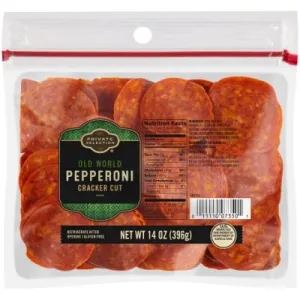 Firm, thinly sliced pepperoni offers balanced savory spice and mild smokiness, with a slightly chewy texture that crisps at edges when heated. Commonly used as a pizza topping, sandwich layer, charcuterie board component, or quick snack. Reviewers praise consistent flavor and convenient packaging, while noting occasional variability in slice size.