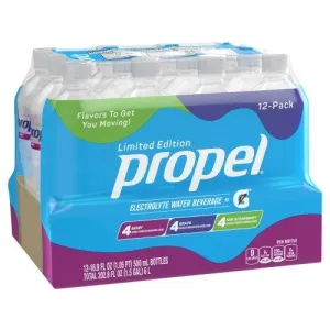 Propel Electrolyte Water Beverage Berry Flavor: WATER, CITRIC ACID, SODIUM HEXAMETAPHOSPHATE (TO PROTECT FLAVOR), NATURAL FLAVOR, SALT, POTASSIUM SORBATE (PRESERVES FRESHNESS), POTASSIUM CITRATE, SODIUM CITRATE, ASCORBIC ACID (VITAMIN C), SUCRALOSE, ACESULFAME POTASSIUM, CALCIUM DISODIUM EDTA (TO PROTECT FLAVOR), CALCIUM PANTOTHENATE (VITAMIN B5), NIACINAMIDE (VITAMIN B3), VITAMIN E ACETATE, PYRIDOXINE HYDROCHLORIDE (VITAMIN B6). Propel Electrolyte Water Beverage Grape Flavor: WATER, CITRIC ACID, SODIUM HEXAMETAPHOSPHATE (TO PROTECT FLAVOR), NATURAL FLAVOR, SALT, POTASSIUM SORBATE (PRESERVES FRESHNESS), POTASSIUM CITRATE, SODIUM CITRATE, ASCORBIC ACID (VITAMIN C), SUCRALOSE, ACESULFAME POTASSIUM, CALCIUM DISODIUM EDTA (TO PROTECT FLAVOR), CALCIUM PANTOTHENATE (VITAMIN B5), NIACINAMIDE (VITAMIN B3), VITAMIN E ACETATE, PYRIDOXINE HYDROCHLORIDE (VITAMIN B6). Propel Electrolyte Water Beverage Kiwi Strawberry Flavor: WATER, CITRIC ACID, SODIUM HEXAMETAPHOSPHATE (TO PROTECT FLAVOR), NATURAL FLAVOR, SALT, POTASSIUM SORBATE (PRESERVES FRESHNESS), POTASSIUM CITRATE, SODIUM CITRATE, ASCORBIC ACID (VITAMIN C), SUCRALOSE, ACESULFAME POTASSIUM, CALCIUM DISODIUM EDTA (TO PROTECT FLAVOR), CALCIUM PANTOTHENATE (VITAMIN B5), NIACINAMIDE (VITAMIN B3), VITAMIN E ACETATE, PYRIDOXINE HYDROCHLORIDE (VITAMIN B6).