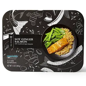 Rice Pilaf (Water, Rice Pilaf [Enriched Long Grain Parboiled Rice {Long Grain Rice, Iron (Ferric Orthophosphate), Thiamine Mononitrate, Folic Acid}, Enriched Orzo {Durum Wheat Semolina, Natural Flavor, Niacin, Iron (Ferrous Sulfate), Thiamine Mononitrate, Riboflavin, Folic Acid}, Seasoning Blend {Hydrolyzed Soy/Wheat Gluten Protein, Maltodextrin, Sugar, Potassium Chloride, Brown Sugar, Salt, Yeast Extract, Corn Syrup Solids, Spices, Onion Powder, Molasses (Dried), Garlic Powder, Turmeric (For Color), Natural Flavors, Soy Sauce (Dried) (Wheat & Soybeans, Salt, Caramel Color), Tamarind.}]), Soy Ginger Salmon (Salmon, Soy Ginger Marinade [Water, Olive Oil Blend {Canola And Olive Oil}, Soy Sauce {Water, Wheat, Soybeans, Salt, Sodium Benzoate (As A Preservative)}, Brown Sugar {Sugar, Molasses}, Lemon Pepper Seasoning {Salt, Black Pepper, Citric Acid, Dehydrated Onion, Dehydrated Garlic, Sugar, Yellow 5 Lake, Maltodextrin, Natural Flavor, Less Than 2% Silicon Dioxide To Prevent Caking}, Garlic Powder, Ginger, Italian Seasoning {Spices}], Sugar Snap Peas [Sugar Snap Peas, Sesame Oil {Sesame Seed Oil}, Black Pepper, Salt]), Soy Ginger Glaze (Soy Sauce [Water, Wheat, Soybeans, Salt, Sodium Benzoate {As A Preservative}], Brown Sugar [Sugar, Molasses], Olive Oil Blend [Canola And Olive Oil], Water, Ginger).