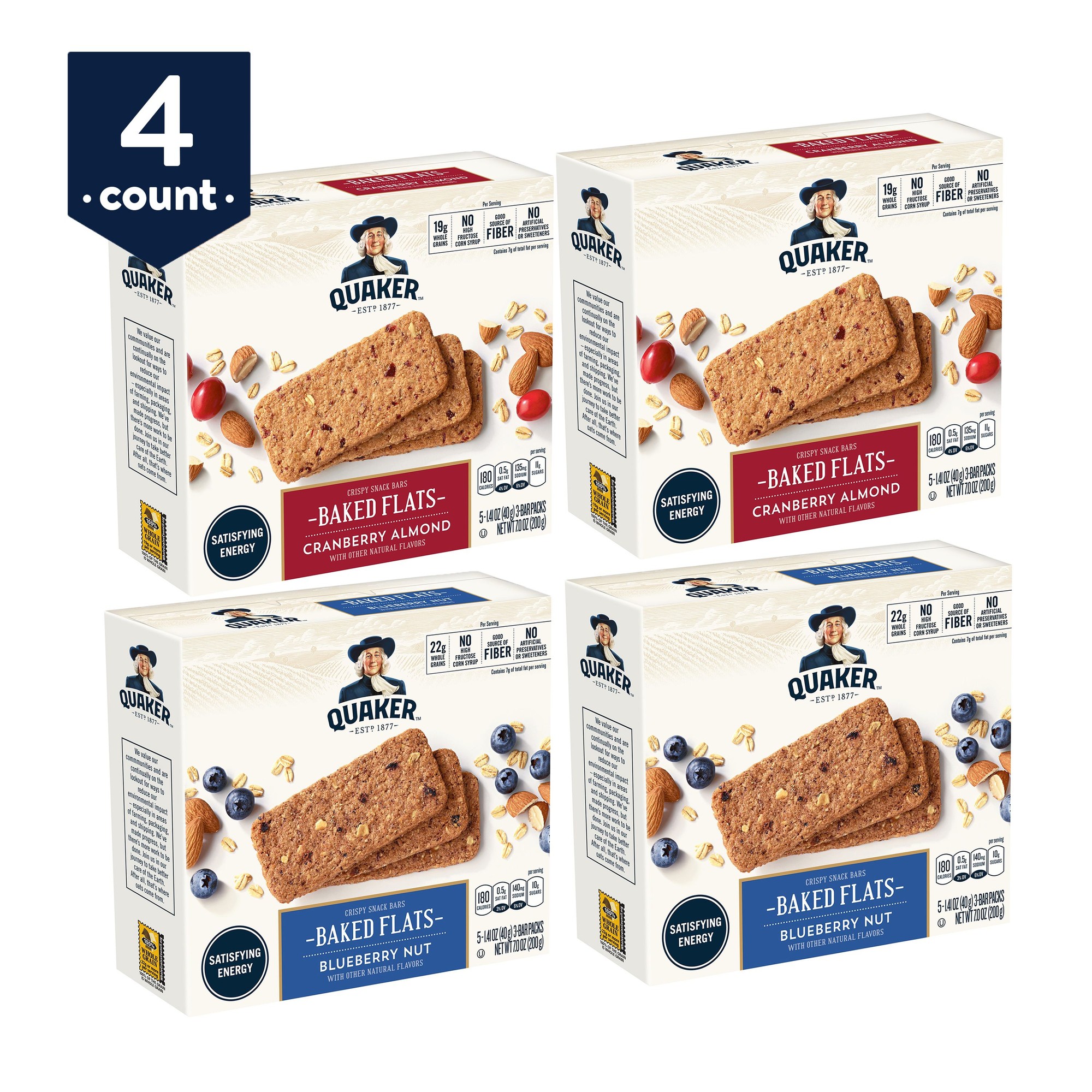 Quaker Baked Flats, Blueberry Nut & Cranberry Almond, 5-3 Bar Packs (Pack of 4)
