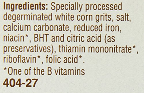 Ingredients: Specially Processed Degerminated White Corn Grits, Salt, Calcium Carbonate, Reduced Iron, Niacin (One of the B Vitamins), BHT and Citric Acid (as Preservatives), Thiamin Mononitrate (One of the B Vitamins), Riboflavin (One of the B Vitamins), Folic Acid (One of the B Vitamins).