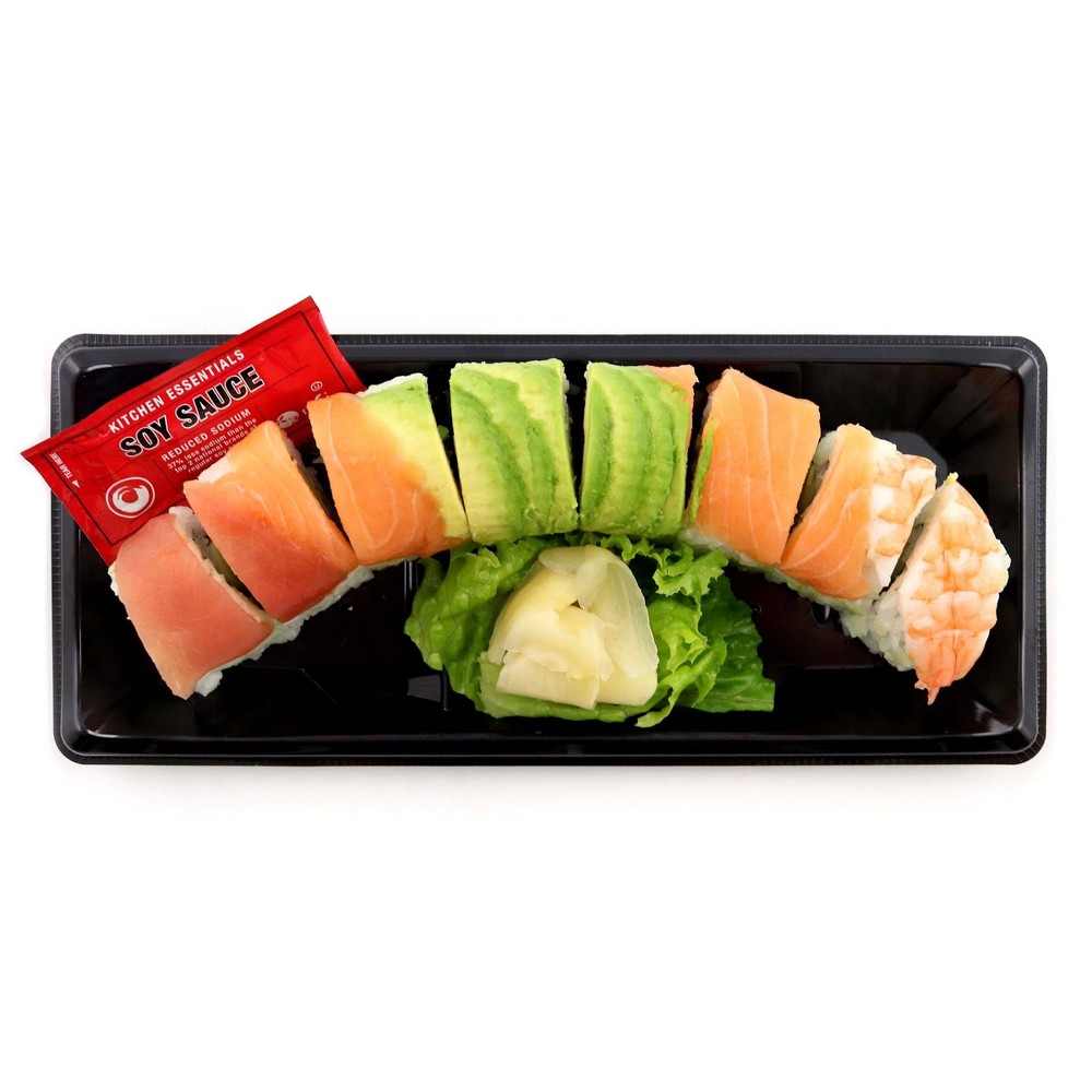 SUSHI RICE (WATER, WHITE RICE, SUSHI VINEGAR (SUGAR, RICE VINEGAR, WATER, SALT, CITRIC ACID, KELP EXTRACT, (KELP EXTRACT, SORBITOL, MALTITOL, HYDROGENATED STARCH HYDROLYSATES, ALCOHOL, SALT, XANTHAN GUM))), AVOCADO, CUCUMBER, RAW SALMON, RAW TUNA PICKLED GINGER (GINGER, WATER, SALT, SUGAR, VINEGAR), COOKED SHRIMP NIGIRI (SHRIMP, SALT), SEAWEED, LETTUCE.