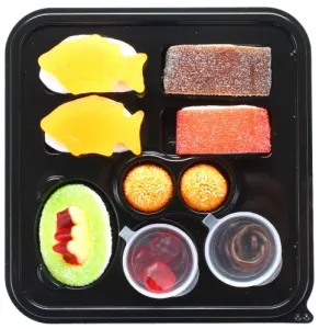 Sugar, Corn Syrup, High Fructose Corn Syrup, Wheat Flour, Water, Gelatin, Contains Less than 2 Percent of: Dextrose, Citric Acid, Concentrated Grape Juice, Vegetable Oils (Palm, Coconut), Corn Starch, Natural and Artificial Flavors, Sorbitol, Malic Acid, Fruit and Vegetable Juices of Color, Artificial colors, Lactic Acid, Pectin, Ascorbic Acid, Tocopherols for freshness, Beeswax, Carnauba Wax, Fumaric Acid, Blue 1.