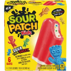REDBERRY FLAVORED SHELL WITH A VANILLA CENTER AND ORIGINAL SOUR PATCH KIDS CANDY BITZ FROZEN DAIRY DESSERT & ICE POP BARS, REDBERRY