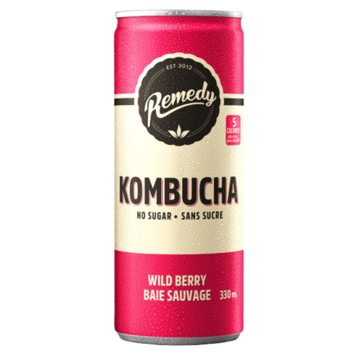 Raw kombucha [carbonated water, raw sugar, black tea, green tea, kombucha culture (bacterial culture and yeast)], erythritol, lemon juice, blueberry extract, blackberry extract, strawberry extract, caramel extract, stevia leaf extract. No sugar remains after Remedy's traditional long-aged fermentation.