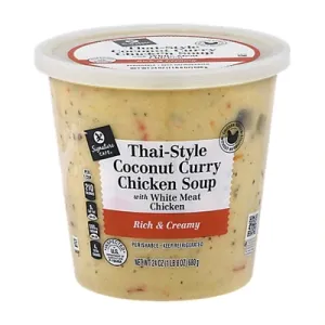 WATER, COCONUT MILK (COCONUT EXTRACT, WATER, CITRIC ACID), WHITE MEAT CHICKEN (WHITE MEAT CHICKEN, WATER, RICE STARCH, SALT), LONG GRAIN PAR BOILED WHITE RICE, HEAVY CREAM, MUSHROOMS, CARROTS, GREEN PEPPERS, RED PEPPERS, CHICKEN BROTH (WATER, CHICKEN BROTH), CONTAINS LESS THAN 2% OF: MODIFIED FOOD STARCH, GREEN CURRY BASE (GREEN CHILIES, GARLIC, SALT, GREEN CHILI POWDER, LEMON JUICE CONCENTRATE, CORIANDER SEED, NATURAL FLAVOR, GINGER, CANOLA OIL, ORGANIC CANE SUGAR, POTATO FLOUR, CUMIN, TURMERIC), CANE SUGAR, WHEAT FLOUR, CULTURED DEXTROSE, GINGER PUREE (GINGER, CITRIC ACID), ROASTED GARLIC PUREE (ROASTED GARLIC, CITRIC ACID), CILANTRO, CANOLA OIL, SEA SALT, RECONSTITUTED LIME JUICE (FILTERED WATER, LIME JUICE CONCENTRATE, PRESERVED WITH SODIUM BENZOATE AND SODIUM BISULFITE), FISH SAUCE (ANCHOVY, SALT, SUGAR), GROUND MAKRUT KAFFIR LIME LEAVES, TURMERIC.