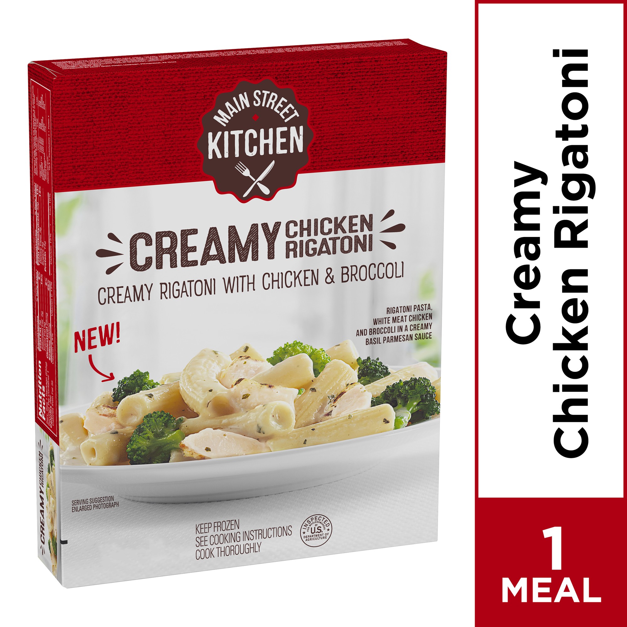 RIGATONI PASTA, WHITE MEAT CHICKEN AND BROCCOLI IN A CREAMY BASIL PARMESAN SAUCE, CREAMY CHICKEN RIGATONI