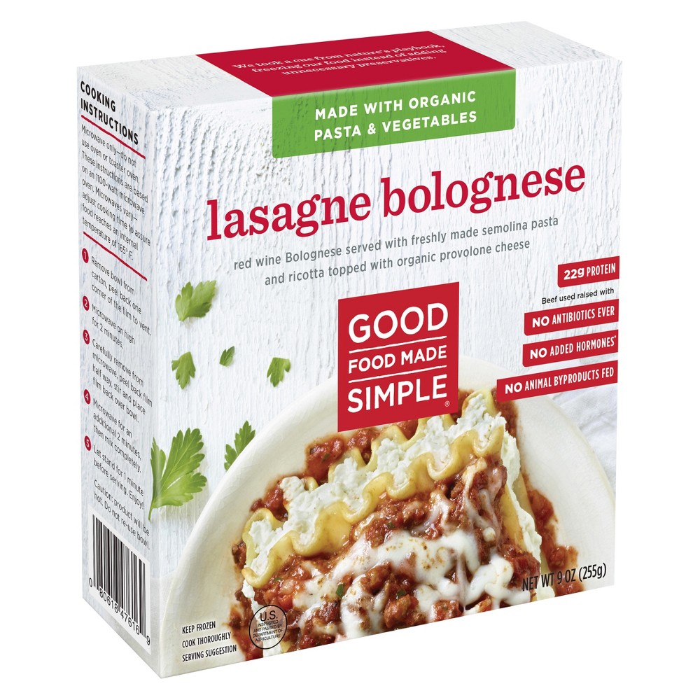 BOLOGNESE MEAT SAUCE (ORGANIC TOMATOES [ORGANIC TOMATOES, ORGANIC TOMATO PUREE, SEA SALT, NATURALLY DERIVED CITRIC ACID], WATER, BEEF PATTY CRUMBLE [BEEF, WATER, POTATO STARCH, SALT], ORGANIC MILK [ORGANIC MILK, VITAMIN D3], ORGANIC ONION, ORGANIC TOMATO PASTE, ORGANIC CARROTS, ORGANIC HEAVY CREAM, ORGANIC BEEF BASE [ORGANIC ROASTED BEEF WITH BEEF BROTH, SALT, ORGANIC CANE SUGAR, NATURAL FLAVOR, ORGANIC DRIED ONION, ORGANIC POTATO STARCH, ORGANIC DRIED GARLIC, ORGANIC CARAMEL COLOR], ORGANIC PARMESAN CHEESE [PARMESAN CHEESE {PASTEURIZED ORGANIC MILK, CHEESE CULTURES, SEA SALT, VEGETABLE ENZYMES}, ORGANIC POWDERED CELLULOSE {TO PREVENT CAKING}], SPICES, EXTRA VIRGIN OLIVE OIL, ORGANIC GARLIC, SUGAR, CORNSTARCH, BURGUNDY WINE TYPE ORGANIC FLAVOR [ORGANIC SUNFLOWER OIL, NATURAL FLAVOR]), COOKED ORGANIC LASAGNA PASTA (WATER, ORGANIC WHEAT SEMOLINA), ORGANIC RICOTTA CHEESE (ORGANIC SKIM MILK, ORGANIC MILK FAT, ORGANIC TAPIOCA STARCH, ORGANIC WHEY PROTEIN CONCENTRATE, ORGANIC CULTURED NON FAT DRY MILK, XANTHAN GUM, CARRAGEENAN GUM, LACTIC ACID), ORGANIC PROVOLONE CHEESE ([PASTEURIZED ORGANIC MILK, CHEESE CULTURES, SEA SALT, ENZYMES], ORGANIC TAPIOCA STARCH [TO PREVENT CAKING]), ORGANIC HEAVY CREAM, ORGANIC PARMESAN CHEESE ([PASTEURIZED ORGANIC MILK, CHEESE CULTURES, SEA SALT, VEGETABLE ENZYMES], ORGANIC POWDERED CELLULOSE [TO PREVENT CAKING]), CORN STARCH, SEA SALT, SPICES.