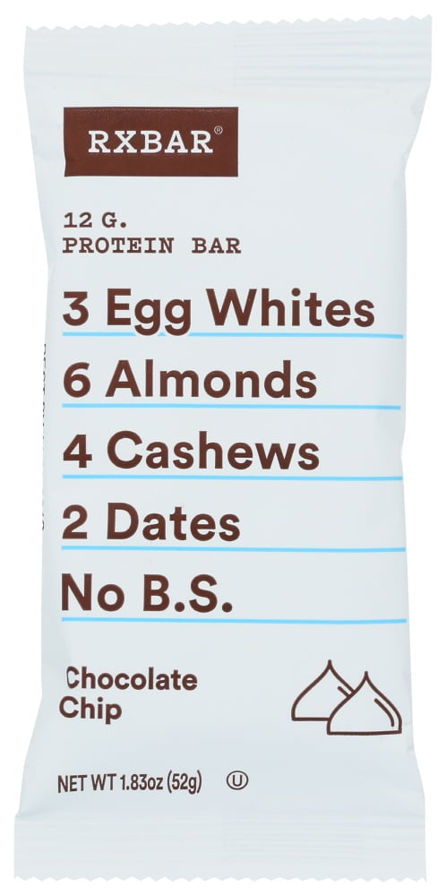 RXBAR - Protein Bar Chocolate Chip - 1.83 oz. (52 g) Nutrition Facts Serving Size: 1 bar (52g) Servings Per Container: 1 Amount Per Serving % DV* Calories 210 Total Fat 9 g 12% Saturated Fat 2 g 10% Trans Fat 0 g Cholesterol 0 mg 0% Sodium 190 mg 8% Total Carbohydrate 22 g 8% Dietary Fiber 5 g 18% Total Sugars 13 g Included 0g Added Sugars 0% Protein 12 g Vitamin D 0 mcg 0% Calcium 60 mg 4% Iron 2 mg 10% Potassium 473 mg 10% * The % Daily Value (DV) tells you how much a nutrient in a serving of food contributes to a daily diet. 2,000 calories a day is used for general nutrition advice. Ingredients: Dates, Egg Whites, Almonds, Cashews, Cacao, Natural Chocolate Flavor, Natural Vanilla Flavor, Sea Salt.Contains: Eggs, Almonds & Cashews.