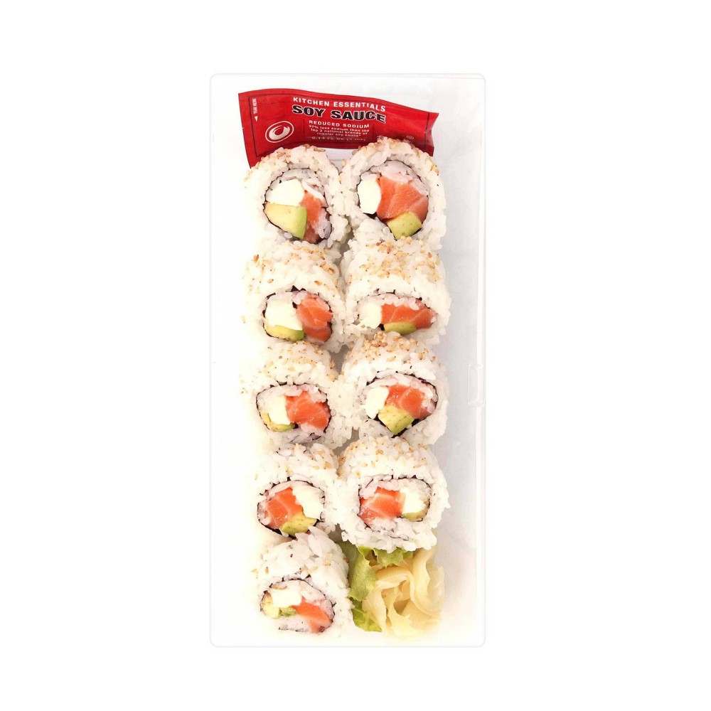 QUINOA BROWN RICE (WATER, BROWN RICE, SUSHI VINEGAR (SUGAR, RICE VINEGAR, WATER, SALT, CITRIC ACID, KELP EXTRACT (KELP EXTRACT, SUGAR ALCOHOL, HYDROGENATED STARCH HYDROLYSATES, ALCOHOL, SALT, XANTHAN GUM)), RED QUINOA), RAW SALMON, AVOCADO, CREAM CHEESE (PASTEURIZED MILK AND CREAM, CHEESE CULTURE, SALT, ORGANIC LOCUST BEAN GUM), PICKLED GINGER (GINGER, WATER, SALT, SUGAR, VINEGAR), SESAME SEEDS, SEAWEED, LETTUCE.