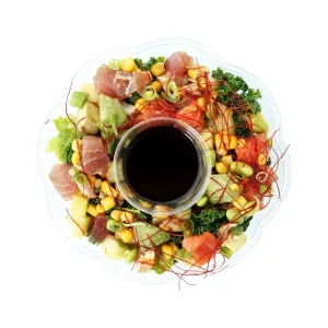 SUSHI RICE (WATER, WHITE RICE, SUSHI VINEGAR (SUGAR, RICE VINEGAR, WATER, SALT, CITRIC ACID, KELP EXTRACT (KELP EXTRACT, SUGAR ALCOHOL, HYDROGENATED STARCH HYDROLYSATES, ALCOHOL, SALT, XANTHAN GUM))), YUZU POKE SAUCE (HIYASHI CHUKA (GLUTEN FREE SOY SAUCE [WATER, SOYBEANS, SALT], SUGAR, WATER, LEMON CONCENTRATE JUICE, SESAME OIL, SALT, XANTHAN GUM), PONZU SOY (WATER, SOY SAUCE [WHEAT, SOY BEANS, SALT] SUGAR, VINEGAR, SALT, YUZU CITRUS JUICE, CONCENTRATED LEMON JUICE, CITRIC ACID, NATURAL FLAVOR, YEAST EXTRACT), YUZU KOSHO (YUZU ORANGE, CHILLI, SALT)), ALBACORE, RAW SALMON, RAW TUNA, AVOCADO, CUCUMBER, LETTUCE, KALE, CORN, SCALLIONS, EDAMAME, SESAME OIL.