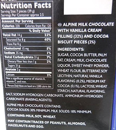 Alpine Milk Chocolate Sugar, Cocoa Butter, Cream Powder, Cocoa Mass, Whole Milk Powder, Butterfat, Emulsifier (Soya Lecithins), Natural Vanilla Flavour, Cocoa: 30 % Minimum May Contain Traces Of Peanuts, Nuts, Gluten And Egg, Alpine Milk Chocolate With Chopped Hazelnuts Sugar, Hazelnuts, Natural Vanilla Flavour, Milk Chocolate Contains - Cocoa Solids: 30 % Minimum, May Contain Traces Of Peanuts, Other Nuts, Gluten And Egg, Cookies And Cream, Sugar, Palm Fat, Cream Powder (From Milk), Sweet Whey Powder (From Milk), Wheat Flour, Butterfat (From Milk), Vanilla Extract, Fat Reduced Cocoa Powder, Lactose, Wheat Starch, Natural Flavouring, Sea Salt, Raising Agents (Sodium Hydrogen Carbonate, Ammonium Hydrogen Carbonate), Milk Chocolate Contains - Cocoa Solids: 30 % Minimum, May Contain Traces Of Peanuts, Nuts And Egg, Caramel Brownie, Sugar, Caramel Pieces, Sugar, Cocoa Butter, Palm Fat, Glucose Syrup, Whole Milk Powder, Butter, Almonds, Lactose, Salt, Natural Flavouring, Bourbon Vanilla Extract, Emulsifiers (Soya Lecithins, Sunflower Lecithins)), Coconut Fat, Other Nuts And Egg