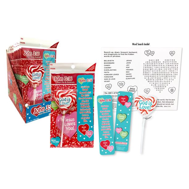 SCRIPTURE CANDY, JOHN 3:16 HEART POP & BOOKMARK SET CANDY, CHERRY POP!