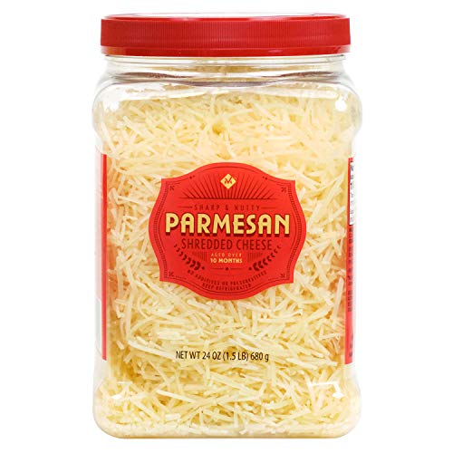 Distinctively sharp with nutty undertones, the shredded cheese offers a fine, slightly dry texture that melts evenly. Commonly used as a topping for pasta, pizza, salads, soups, and casseroles. Customer reviews note robust flavor, reliable meltability, convenient packaging, occasional clumping or freshness variability, and comments about price and satisfaction ratings.
