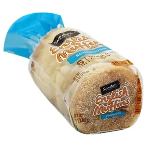 Sourdough English muffins offer a mildly tangy flavor, crisp toasted exterior and soft, chewy interior with characteristic nooks that hold butter, spreads or egg. Commonly used for breakfast sandwiches, toast, and eggs Benedict. Reviews often note reliable texture and toasting performance, with occasional comments on size and freshness issues reported.