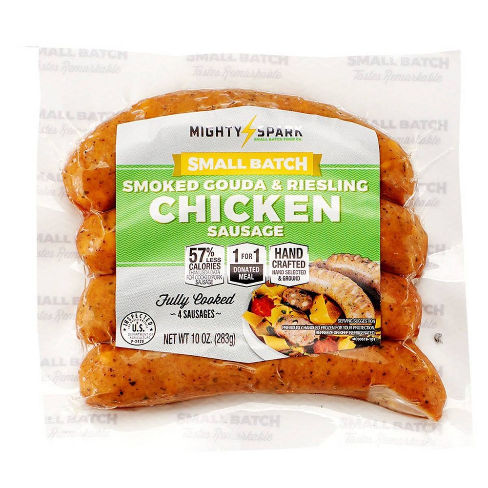 CHICKEN, SMOKED GOUDA, [GOUDA CHEESE (PASTEURIZED MILK, CHEESE CULTURE, SALT, ENZYMES), ANNATTO (COLOR), POWDERED CELLUOSE (ANTI-CAKING), NATURAL SMOKED FLAVORING], WATER, LESS THAN 2%: SALT, RIESLING WINE, BROWN SUGAR, ROASTED GARLIC, GARLIC POWDER, SPICES, ONION POWDER, VINEGAR, KALE. IN PORK CASING.