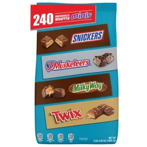 Twix Brand Minus: Milk Chocolate (Sugar, Cocoa Butter, Chocolate Skim Milk, Lactose, Mikfat, Soy Lecithin, Pgpr, Artificial Flavors), Sugar, Enriched Wheat Flour (Wheat Flour, Niacin, Reduced Iron, Thiamine Mononitrate, Riboflavin, Folic Acid), Palm Oil, Corn Syrup, Skim Milk, Dextrose, Less Than 2% - Food Starch-modified, Salt, Cocoa Powder, Baking Soda, Soy Lecithin, Artificial Flavor, 3 Musketeers Brand Minus: Milk Chocolate (Sugar, Chocolate, Cocoa Butter, Skim Milk, Lactose, Milkfat, Soy Lecithin), Hydrogenated Palm Kernel Oil, Palm Oil, Less Than 2% - Cocoa Powder Processed With Alkali, Egg Whites, Artificial And Natural Flavors, Snickers Brand Minus: Milk Chocolate (Sugar, Cocoa Butter, Chocolate, Skim Milk, Lactose, Milkfat, Soy Lecithin, Artificial Flavor), Peanuts, Lactose, Artificial Flavor, Milky Way Brand Minus: Milk Chocolate (Sugar, Cocoa Butter, Skim Milk, Chocolate, Lactose, Milkfat, Soy Lecithin, Artificial Flavor), Less Than 2% - Milkfat, Cocoa Powder Processed With Alkali, Malted Barley, Chocolate, Artificial Flavor, Twix Brand Minus: Contains Milk, Soy, Wheat, May Contain Peanuts, 3 Musketeers Brand Minus: Contains Milk, Egg And Soy, May Contain Peanuts, Snickers Brand Minus: Contains Peanuts, Milk, Egg And Soy, May Contain Tree Nuts, Milky Way Brand Minus: Contains Milk, Egg And Soy, May Contain Peanuts