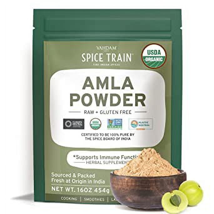 SPICE TRAIN, Organic Amla Powder (454g/16oz) Amalaki | Indian Gooseberry Powder | Resealable Zip Lock Pouch | 100% Raw Amla Powder from India | Perfect for Cooking, Smoothies, Latte & Tea