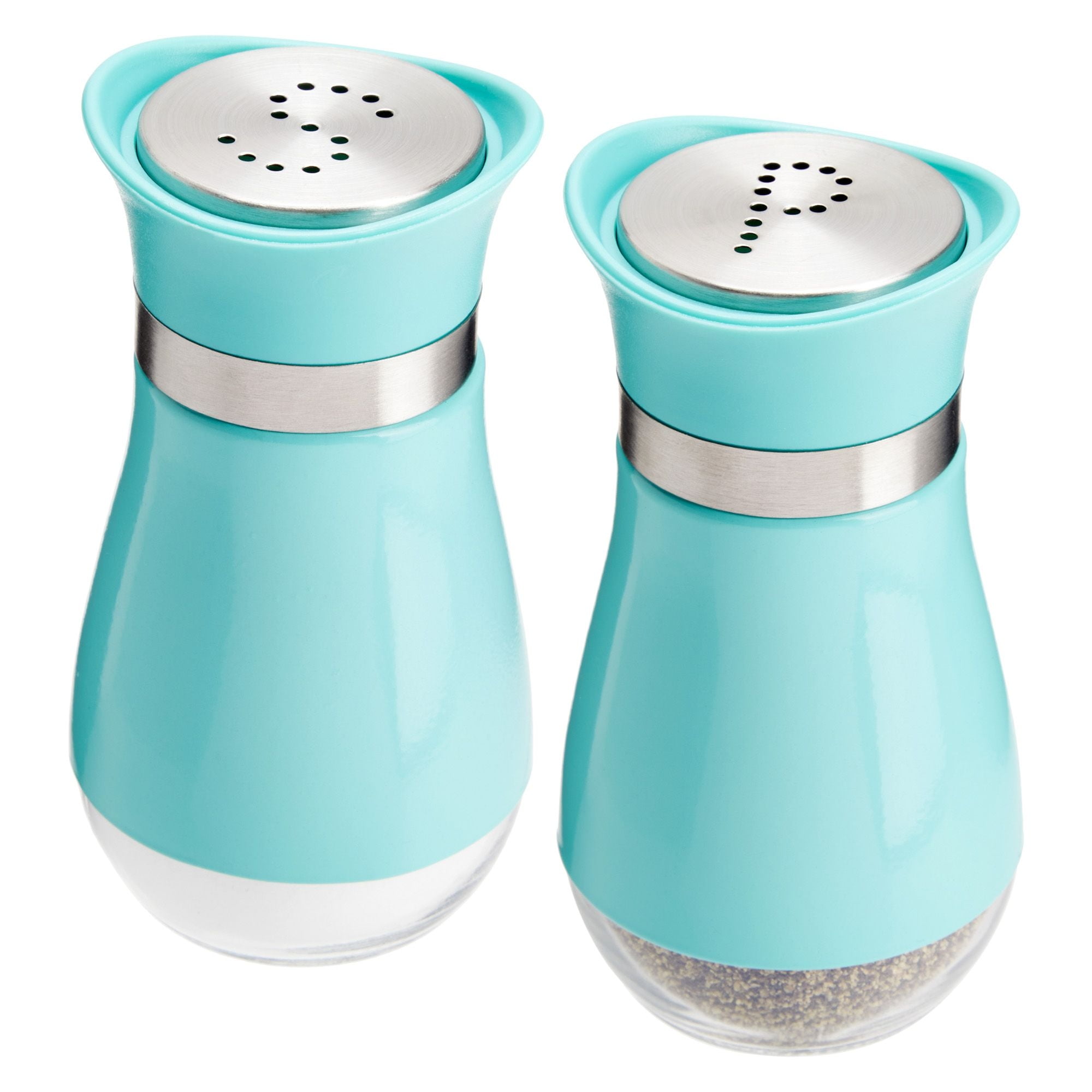 Stainless Steel Turquoise Salt and Pepper Shakers with Transparent Glass Bottoms and Perforated "S" and "P" Screw-Off Caps (4oz)