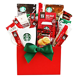 Biscotti (1,5 Oz Each, 2 Count), Starbucks Tazo Teabags (3 Count), Shortbread Fingers (1 Oz Each, 1 Count), Shortbread Highlanders (1,4 Oz Each, 1 Count), Starbucks Coffee: Assorted Varieties (2,5 Oz Each, 2 Count), Tcho Chocolate Bar (0,8 G Each, 3 Count), Starbucks Via Coffee (1 Count), Starbucks Mug (11 Oz Each, 1 Count)