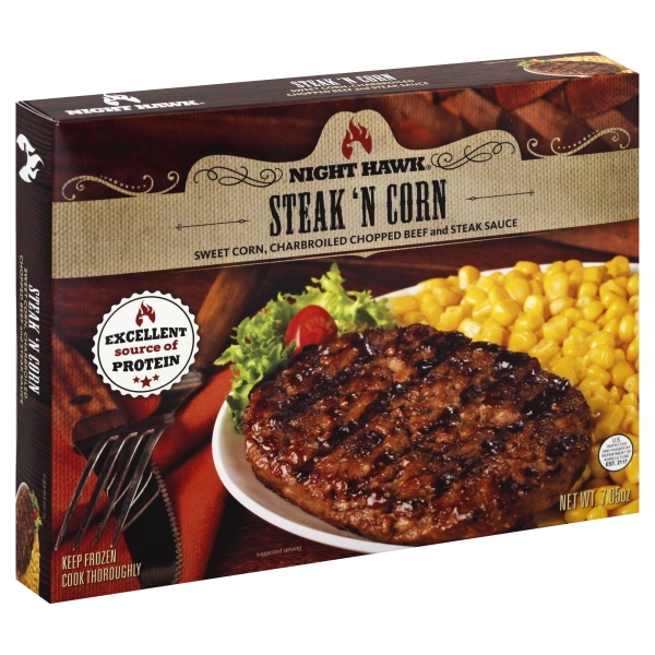 STEAK 'N CORN SWEET CORN, CHARBROILED CHOPPED BEEF AND STEAK SAUCE, STEAK 'N CORN