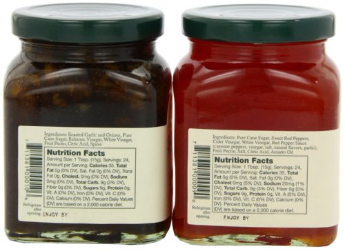 Red Pepper Jelly Pure Cane Sugar, Sweet Red Peppers, Cider Vinegar, White Vinegar, Red Pepper Sauce (Cayenne Peppers, Vinegar, Salt, Natural Flavors, Garlic), Fruit Pectin, Salt, Citric Acid, Annatto Oil, Hot Pepper Jelly Pure Cane Sugar, Onions, Roasted Red Peppers, Jalapenos, Hot Sauce (Aged Cayenne Red Pepper, Vinegar, Salt, Natural Flavor, Garlic), Red Pepper Flakes, Ancho Chili Powder