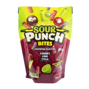 CORN SYRUP, SUGAR, WHEAT FLOUR, HIGH FRUCTOSE CORN SYRUP, CITRIC ACID, MALIC ACID, TARTARIC ACID, FOOD STARCH MODIFIED, PALM OIL, GLYCERYL MONOSTEARATE, SODIUM CITRATE, GLYCERIN, ARTIFICIAL FLAVORS, COLOR ADDED BLUE 1, YELLOW 5 (TARTRAZINE), RED 40.