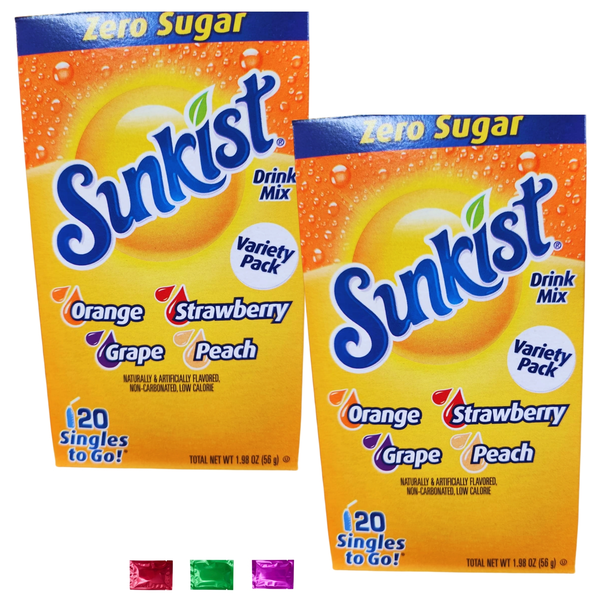Sunkist Zero Sugar Drink Mix Variety Pack Singles 2 Boxes 40 Servings Total, Low Calorie Fruit Flavors Orange Grape Strawberry Peach, Hydration Refreshment w/ Snoep in Beperkte Oplage