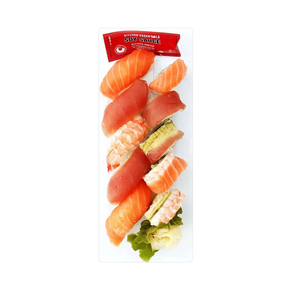SUSHI RICE (WATER, WHITE RICE, SUSHI VINEGAR (SUGAR, RICE VINEGAR, WATER, SALT, CITRIC ACID, KELP EXTRACT (KELP EXTRACT, SUGAR ALCOHOL, HYDROGENATED STARCH HYDROLYSATES, ALCOHOL, SALT, XANTHAN GUM))), RAW TUNA, RAW SALMON, AVOCADO, CRABSTICK (FISH PROTEIN (ALASKA POLLOCK AND/OR PACIFIC WHITING, MSC CERTIFIED), WATER, CANE SUGAR, POTATO STARCH, TAPIOCA STARCH, EGG WHITE, CONTAINS LESS THAN 2% OF NATURAL FLAVOR (CRAB JUICE), POTASSIUM CHLORIDE, SALT, YEAST EXTRACT, SOY LECITHIN, COLOR ADDED (PAPRIKA, TOMATO LYCOPENE)), COOKED SHRIMP NIGIRI (SHRIMP, SALT), PICKLED GINGER (GINGER, WATER, SALT, SUGAR, VINEGAR), CUCUMBER, LETTUCE, SEAWEED.