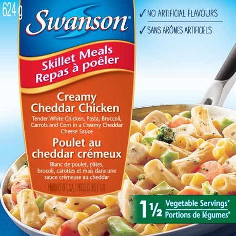 Alfredo Sauce Water, Cream Blend (Cream, Skim Milk, Skim Milk Powder), Grated Parmesan Cheese Product (Parmesan Cheese, Cornstarch, Cellulose Gel), Flavoured Butter (Butter, Flavour), Parmesan Cheese Seasoning, Salt, Skim Milk, Garlic Powder, Modified Cornstarch, Seasoning, Hydrolyzed Corn Gluten, Spices, Xanthan Gum, Cooked Enriched Pasta Water, Pasta, Seasoned Diced Coated Cooked Chicken Chicken, Water, Isolated Soy Protein, Sodium Phosphates, Natural Flavour, Coating: Corn Flour, Enriched Flour, Cornstarch, Soybean Oil, Maltodextrin, Caramel Colour, Spices, Carrots, Broccoli, Peas, Contains: Milk, Wheat, Soy